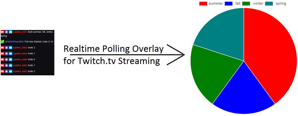 This WebApp is used to create an overlay to handle realtime voting from Twitch chat rooms. The streamer simply authenticates with Twitch through the website, and is given an Overlay URL. They can browse to this URL, or add it as a source in any modern broadcasting software. The overlay is then controlled through the chat room on their channel. Using simple commands, the host can start and end polls, with !poll x,y,z and !endpoll respectively; the other people in the chat can vote using !vote [#].